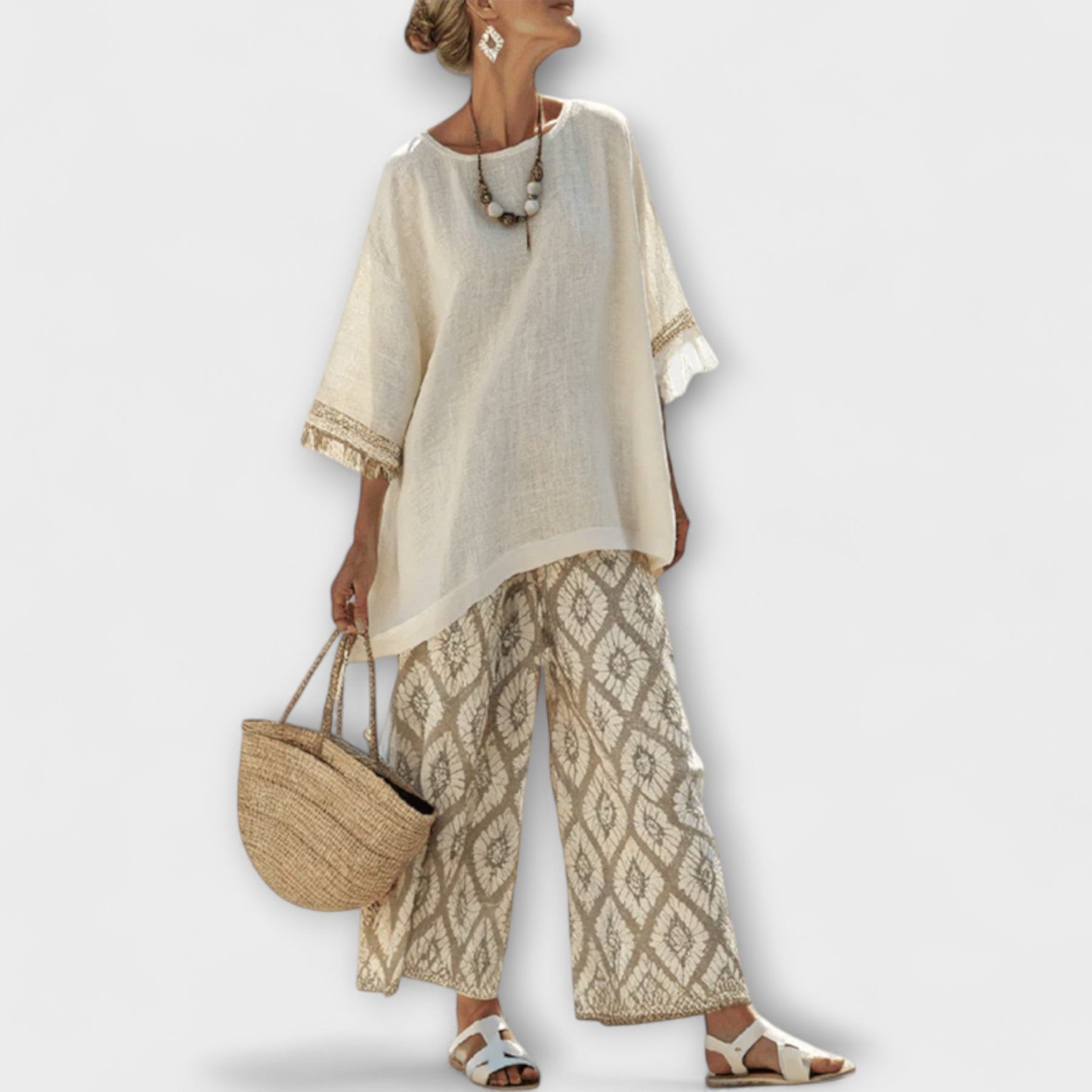This stunning ensemble features a soft-cut blouse adorned with artisanal fringe details, paired with fluid wide-leg pants showcasing a unique geometric print. Designed for both comfort and style, this set is perfect for sunny days and bohemian vibes.