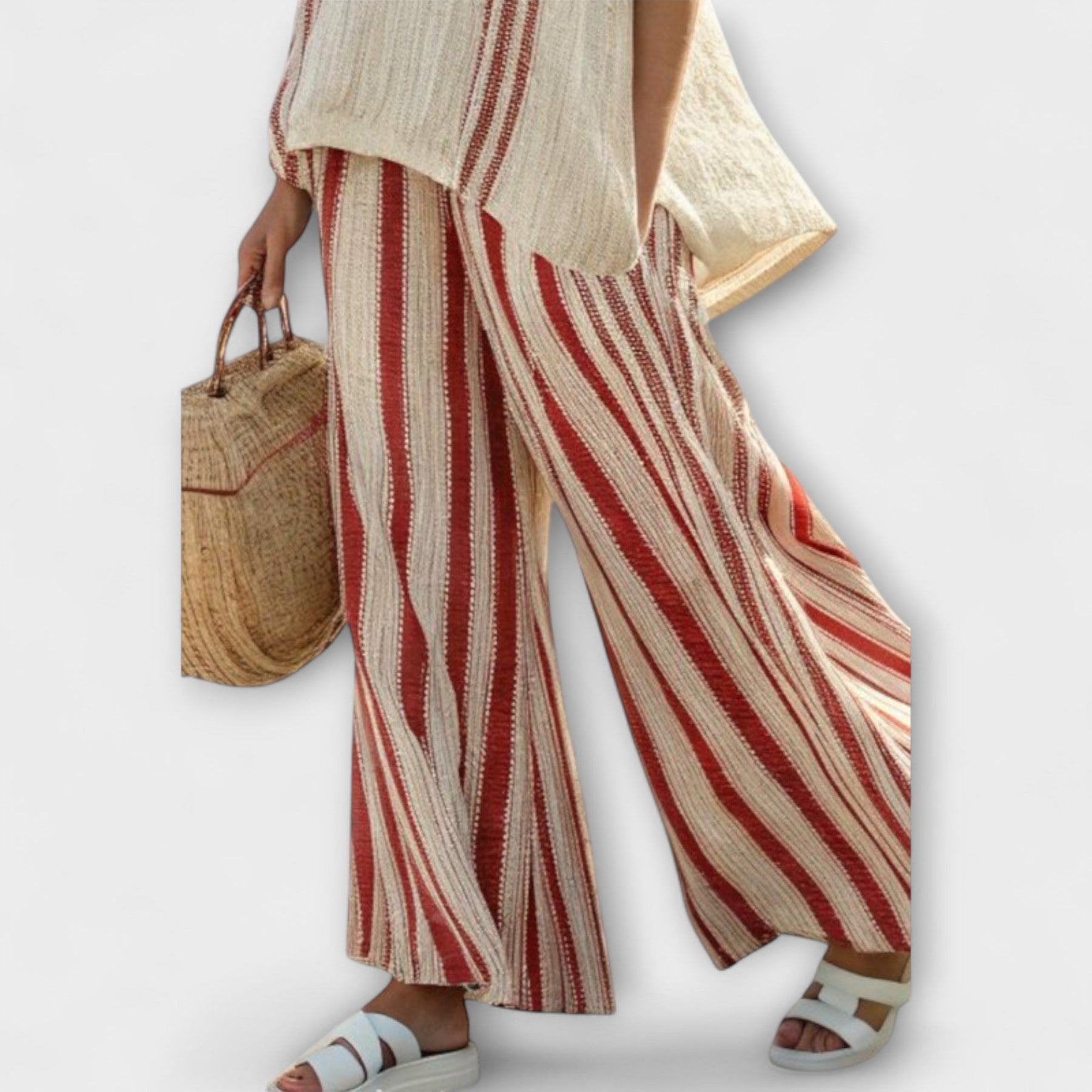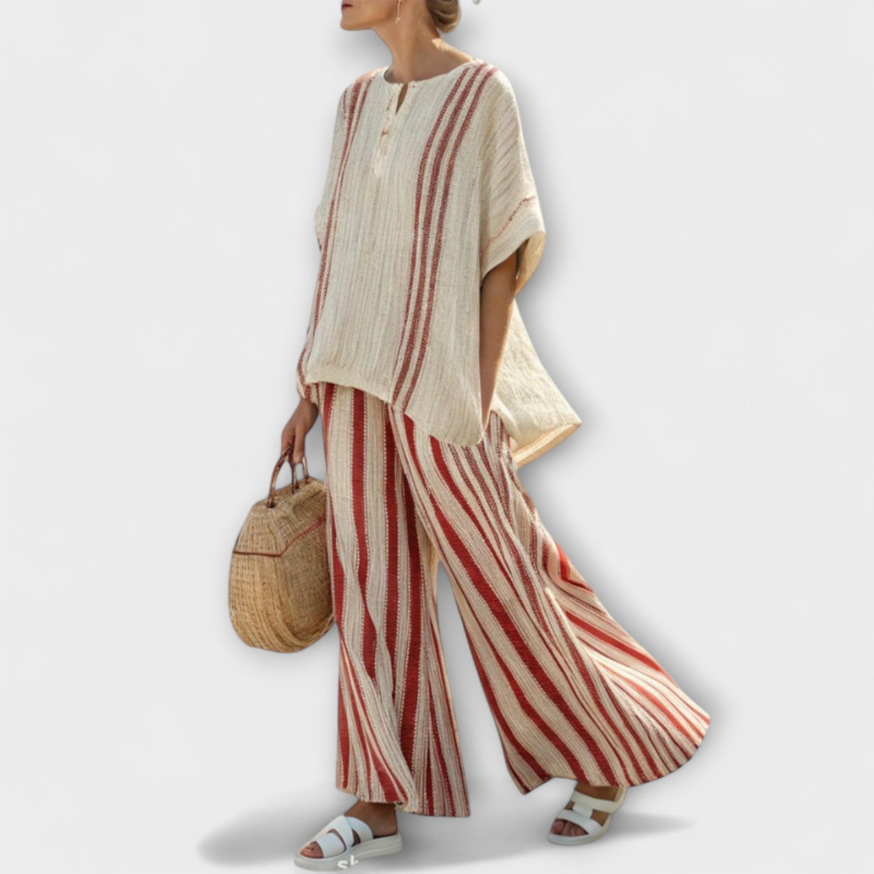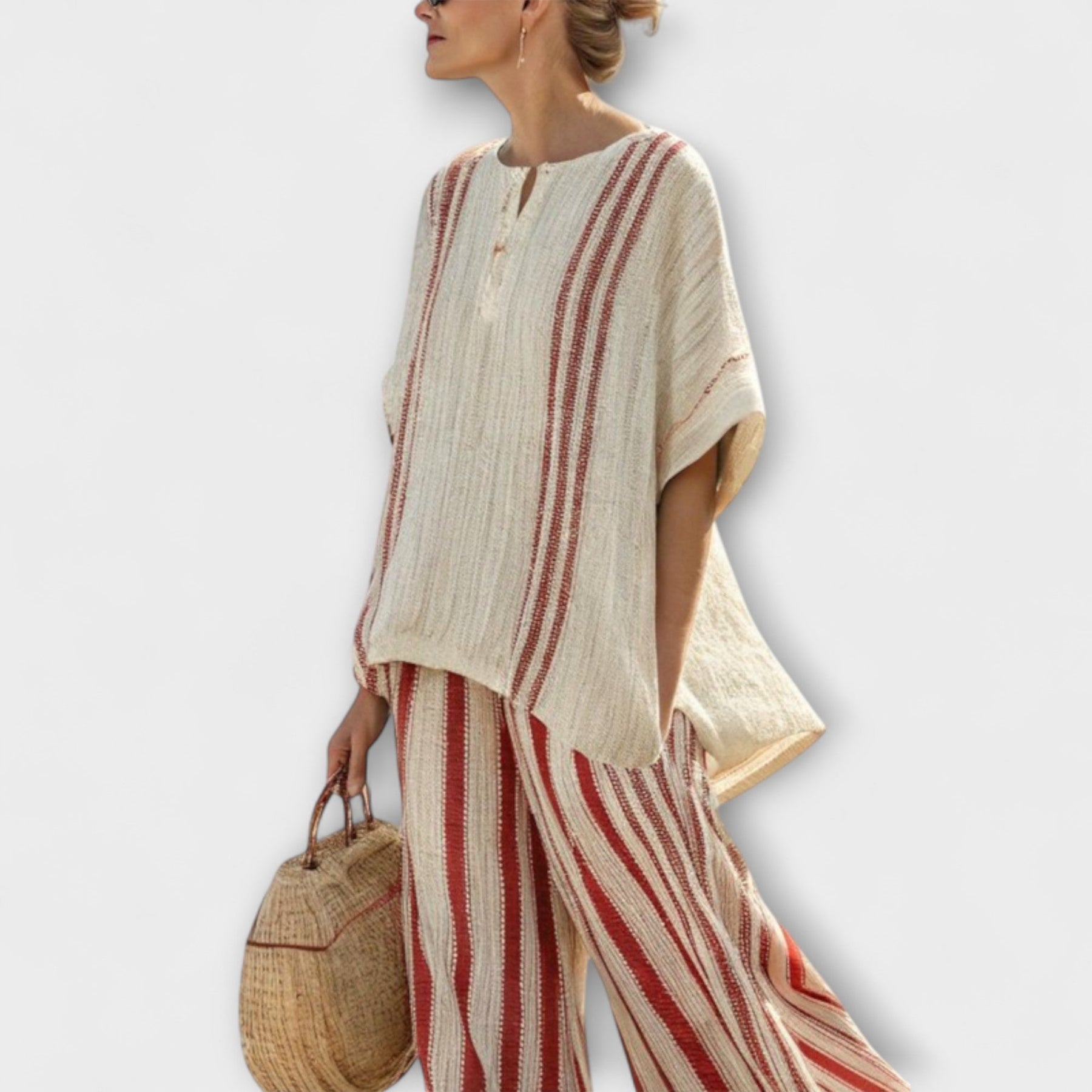 Experience Coastal Relaxation with the Daisy Set, designed for comfort and style. This chic ensemble features a loose-fitting blouse with a flattering V-neck and wide-leg pants adorned with vertical stripes that elongate your figure.