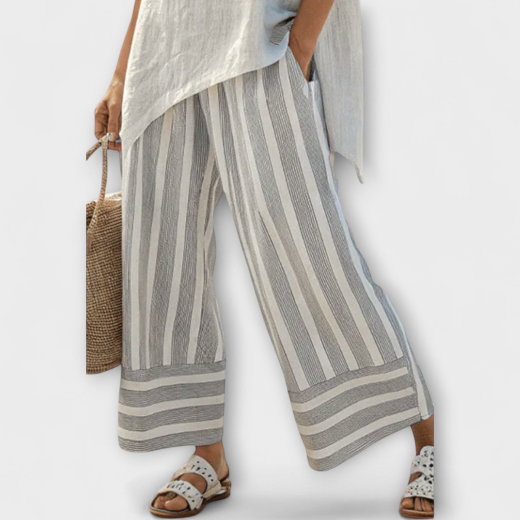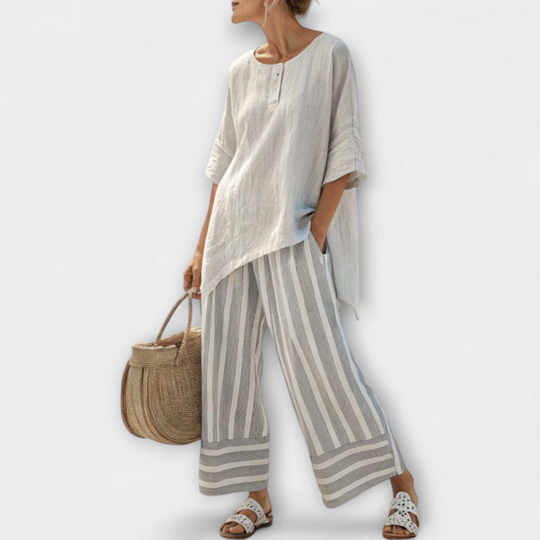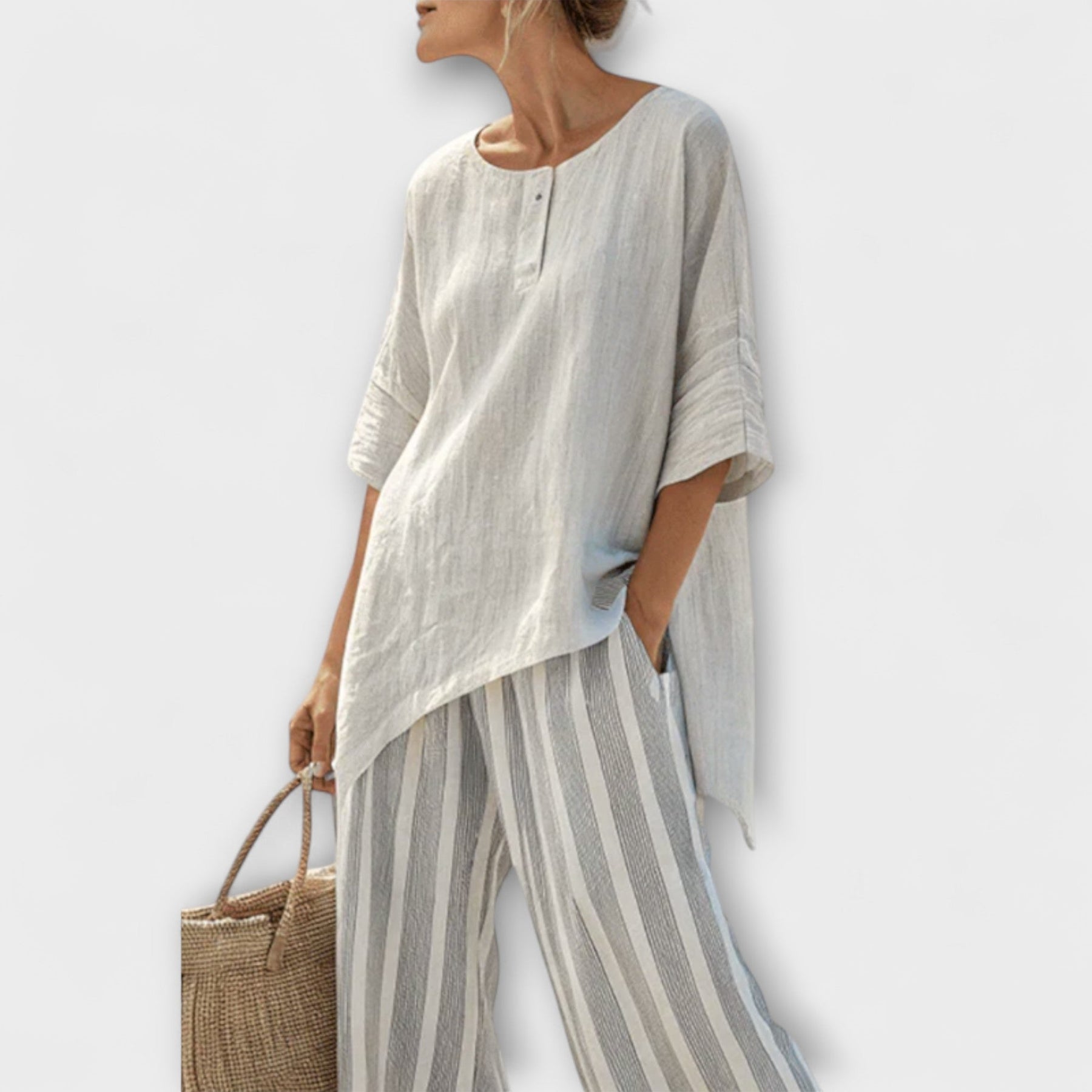 Experience the perfect blend of comfort and style with our Daisy Set. This chic ensemble features a relaxed-cut asymmetric blouse paired with wide, vertically striped pants, designed to create a fresh and sophisticated look.