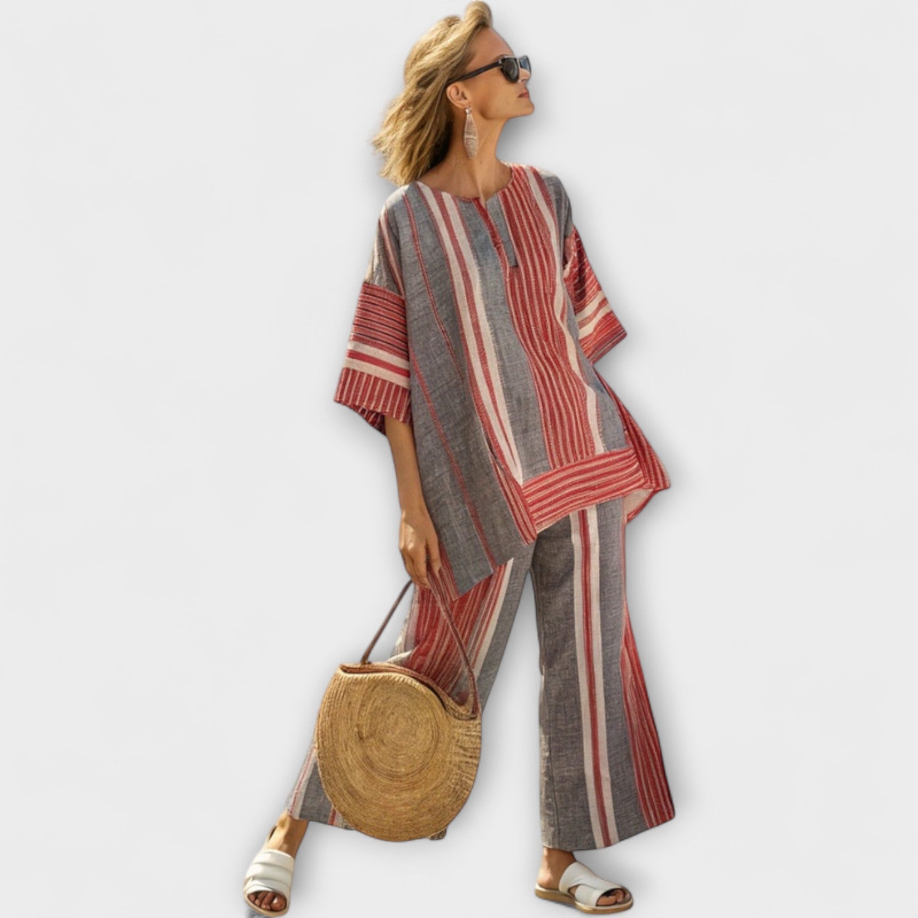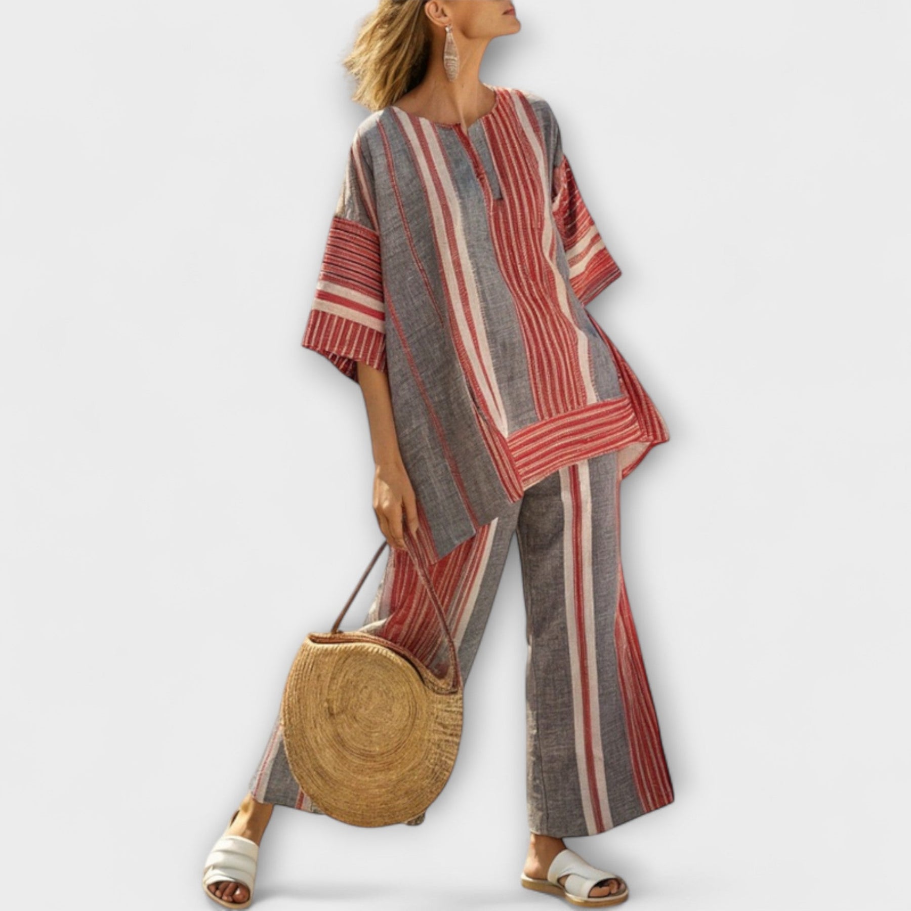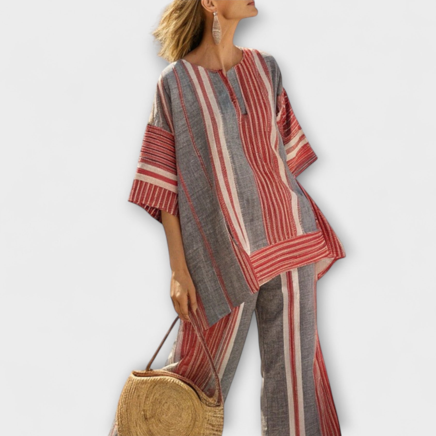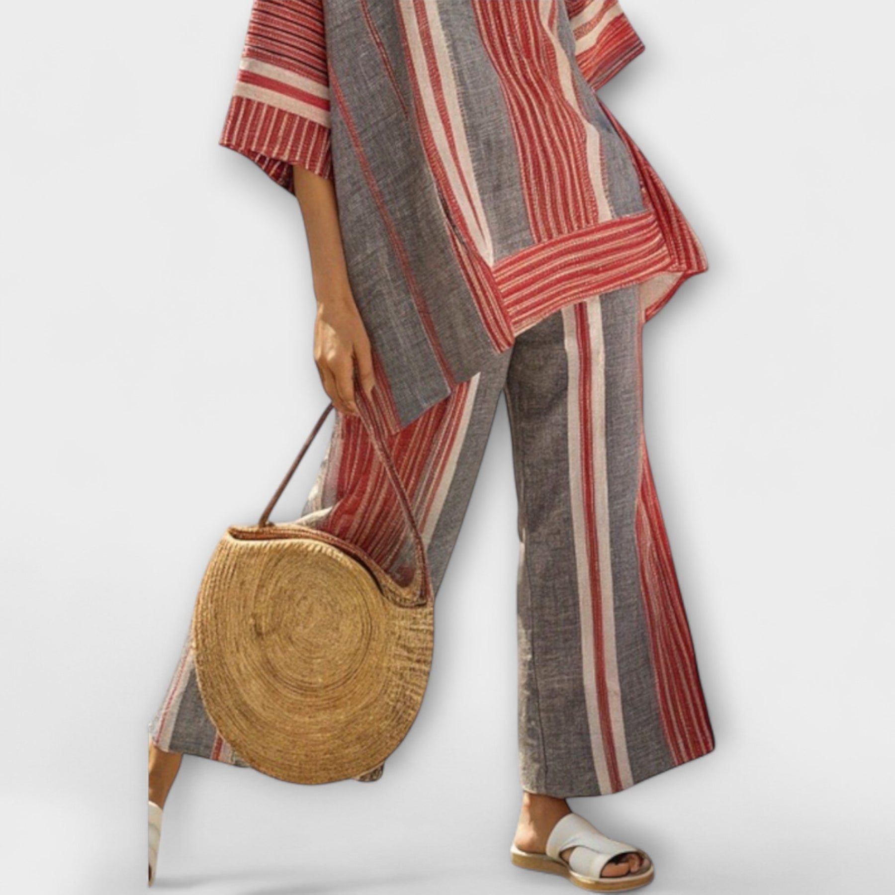 Embrace the Mediterranean vibe with our Daisy Set, designed for those who appreciate a relaxed yet stylish look. This set features a beautiful blend of coral stripes and stone gray tones, creating a wide and flowing silhouette that captures the essence of summer.